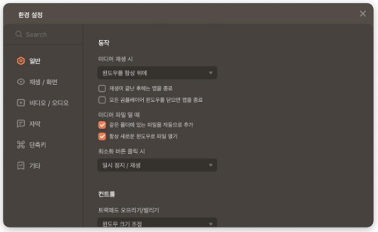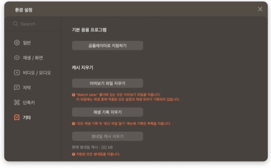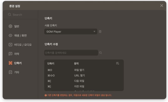 - 단축키 환경 설정: 플레이어 사용 시 쉽게 기능들을 이용할 수 있는 단축키를 설정할 수 있습니다. 원하는 단축키를 추가하거나 기존의 단축키를 수정하여 사용할 수 있습니다.