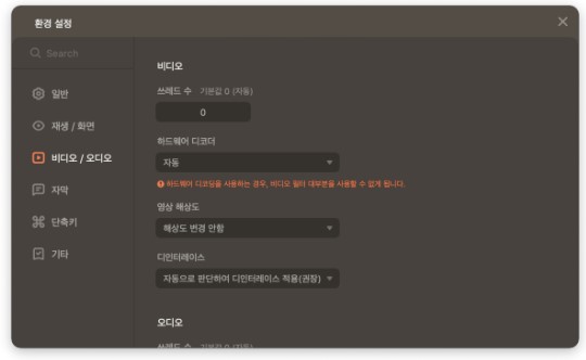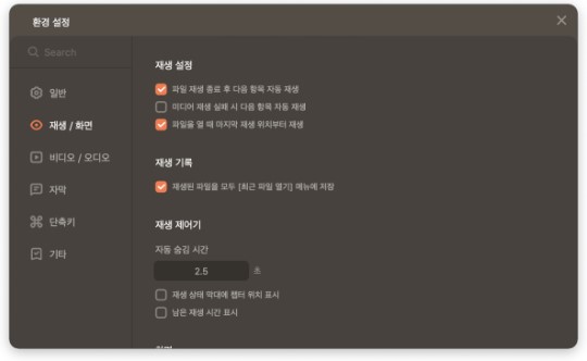 - 재생/화면 환경 설정: 재생을 하는 동안의 사용자 환경 설정과 화면에 관한 설정을 조정할 수 있습니다.