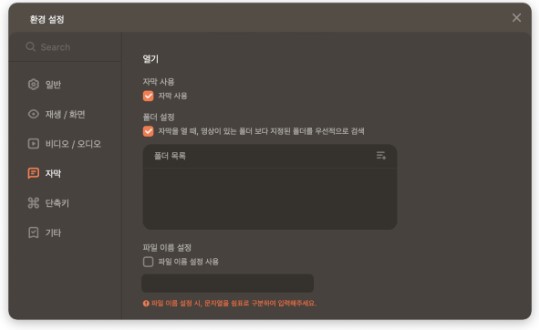 - 자막 환경 설정: 자막을 여는 폴더를 설정하거나 자막의 위치를 조정하고 ASS 자막, 온라인 자막 등 여러 자막들을 관리합니다.