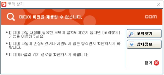외부 코덱의 설치가 필요한 영상 파일을 재생하면 코덱 찾기 창이 나타납니다. 이때 코덱찾기 버튼을 클릭하면 필요한 코덱의 정보나 해당 코덱을 다운로드할 수 있는 경로를 알려줍니다.