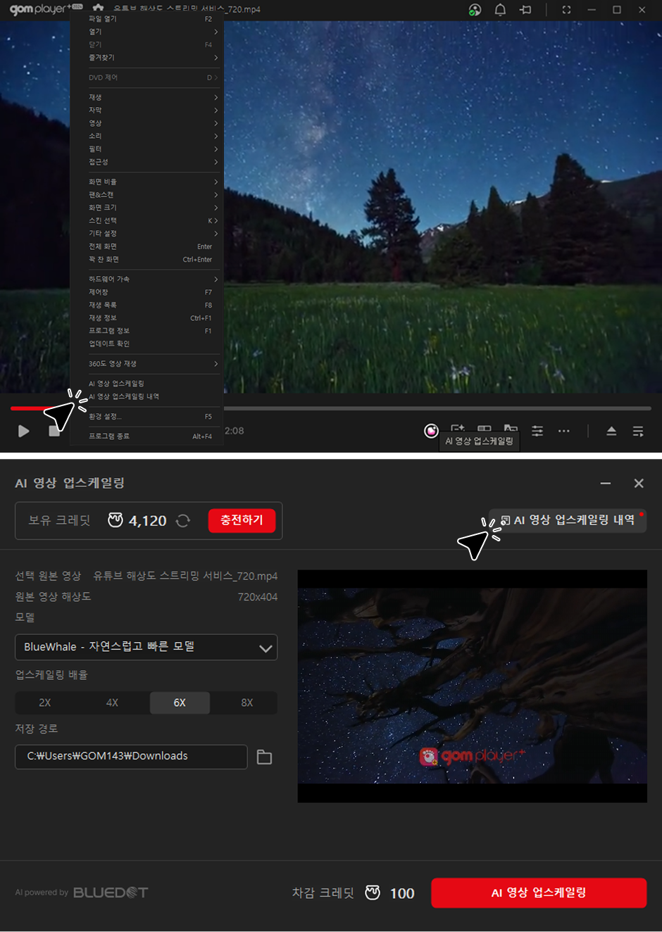 곰플레이어+에서 마우스 오른쪽 버튼을 클릭하면 나타나는 컨텍스트 메뉴의 'AI 영상 업스케일링 내역' 버튼 또는 AI 영상 업스케일링 상단 'AI 영상 업스케일링 내역' 버튼을 클릭하여 진입할 수 있습니다.