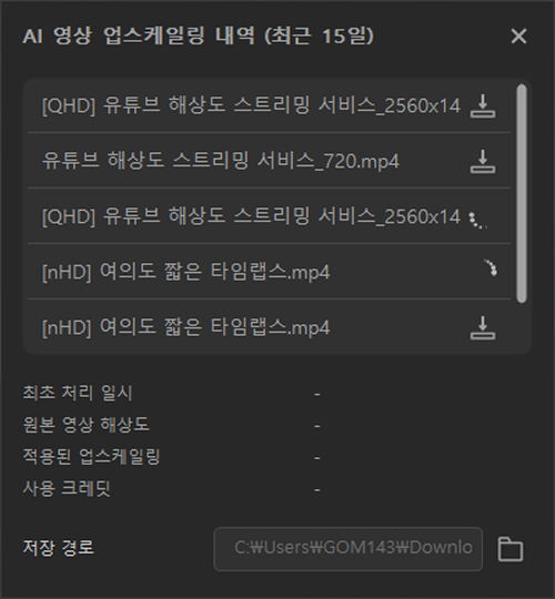 AI 영상 업스케일링 내역에서는 업스케일링 처리가 완료된 영상들의 목록을 확인하고, 다시 다운로드할 수 있습니다.