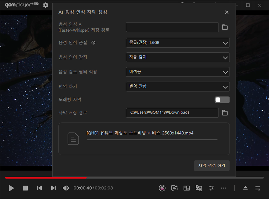 하단 컨트롤 바 에서 'AI 음성 인식 자막 생성' 아이콘 (F11)을 클릭하여 팝업 창을 엽니다.