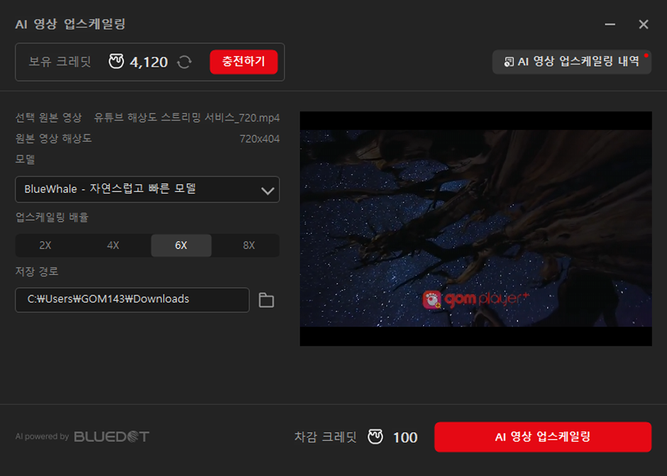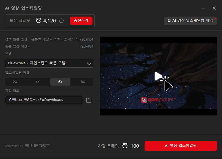 - 4) 2배, 4배, 6배, 8배 중 하나를 선택하여 적용할 수 있으며, 최대 4K(3840x2160) 목표 배율까지 선택 가능합니다.