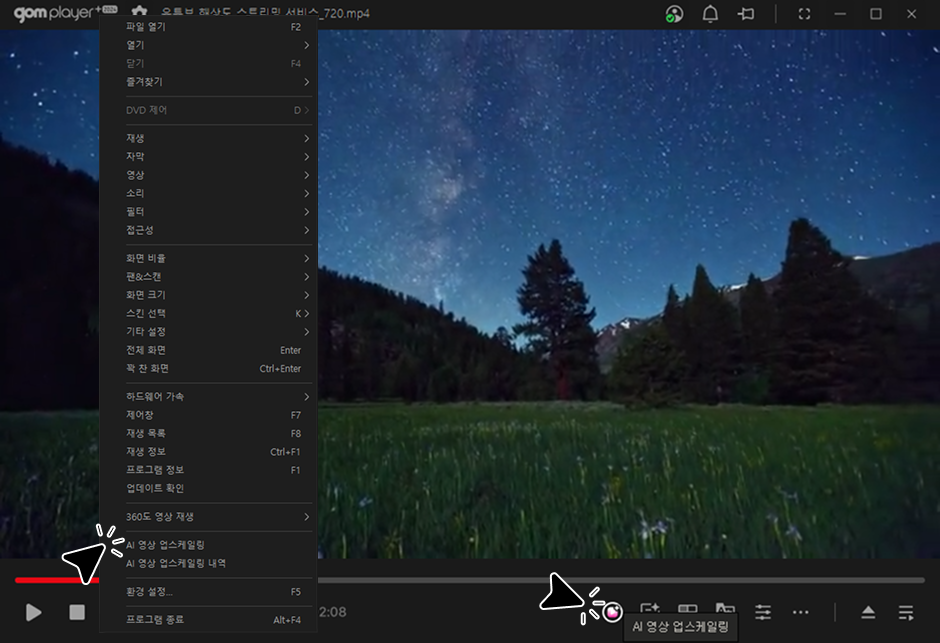 곰플레이어+ 하단 컨트롤 바의 AI 영상 업스케일링 아이콘 버튼 또는 마우스 오른쪽 버튼을 클릭하면 나타나는 컨텍스트 메뉴에서 'AI 영상 업스케일링' 버튼을 클릭하여 AI 영상 업스케일링 원본 영상 파일 업로드를 시작할 수 있습니다.