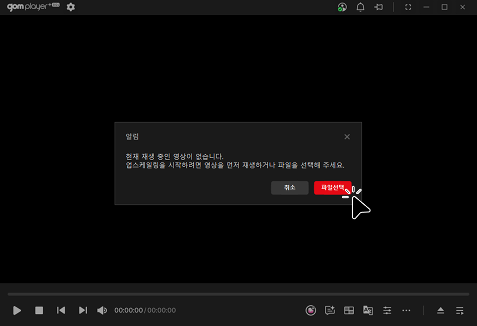 - 곰플레이어가 실행되었지만, 아직 재생 중인 영상이 없는 상태에서 AI 영상 업스케일링 버튼을 클릭하면 시스템의 '파일 열기' 대화 상자가 나타납니다.