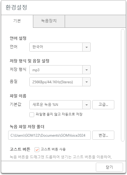 자세한 녹음 설정은 상단 환경설정 아이콘을 클릭 시 생성되는 환경설정 창에서 설정할 수 있습니다.