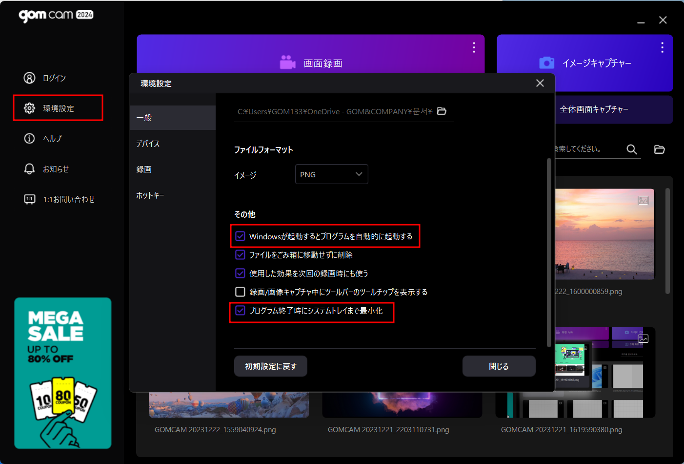 「ホーム画面」>「環境設定」>「一般」>「WindowsWindowsが起動するとプログラムを自動的に起動する」と「プログラム終了時にシステムトレイまで最小化」をチェックします。