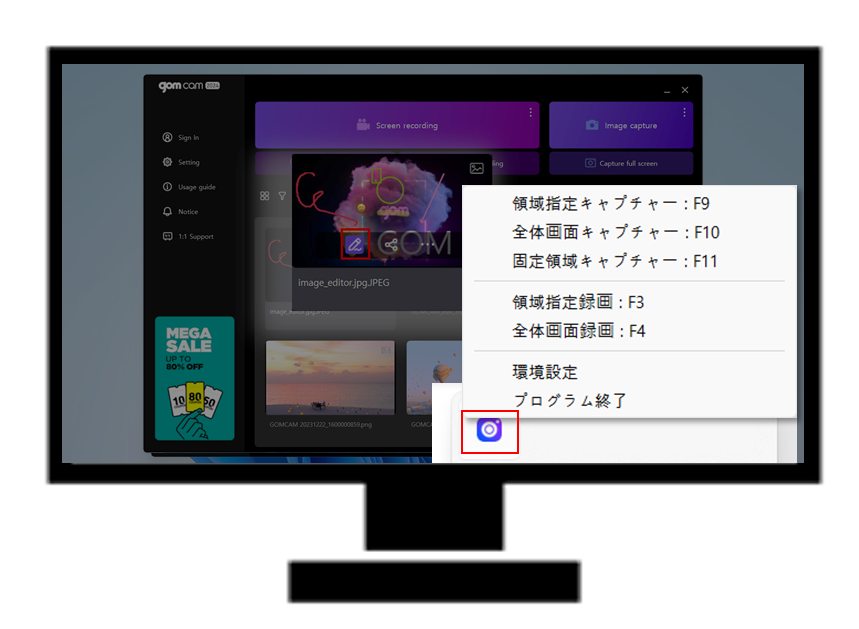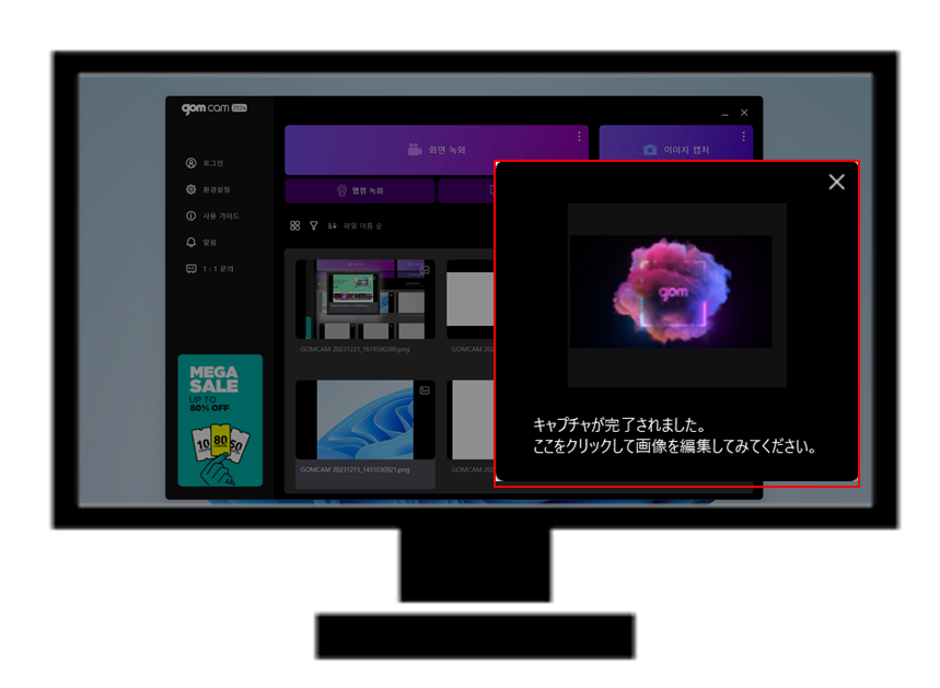 キャップチャーの後、キャップチャー完了ポップアップが現れます。そのポップアップをクリックしたらイメージ編集機が自動的に起動されます。