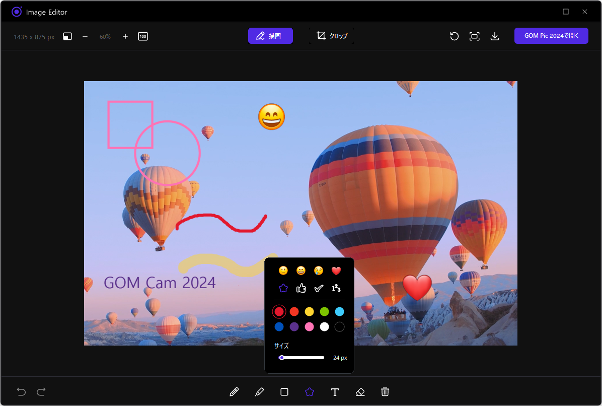 描画」をクリックすると、下段に描画ツールが現れます。そのツールで画像を飾ることができます。