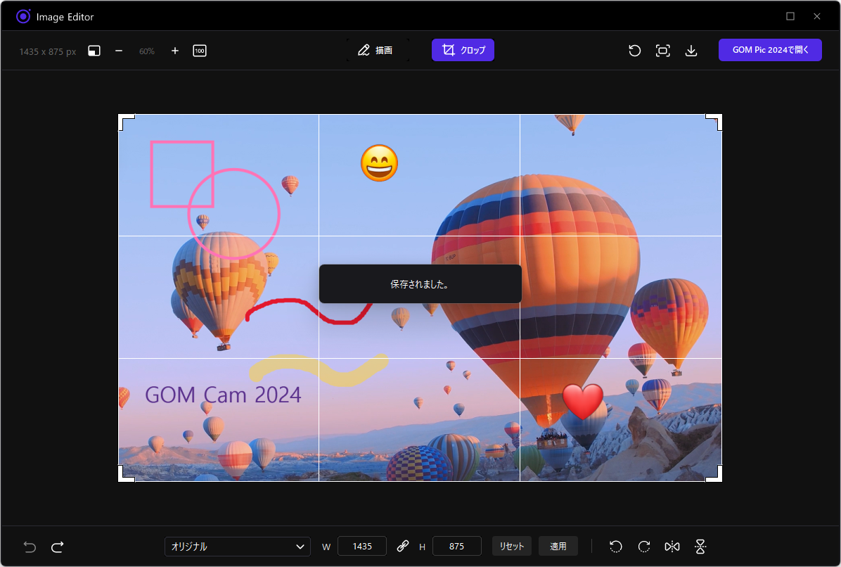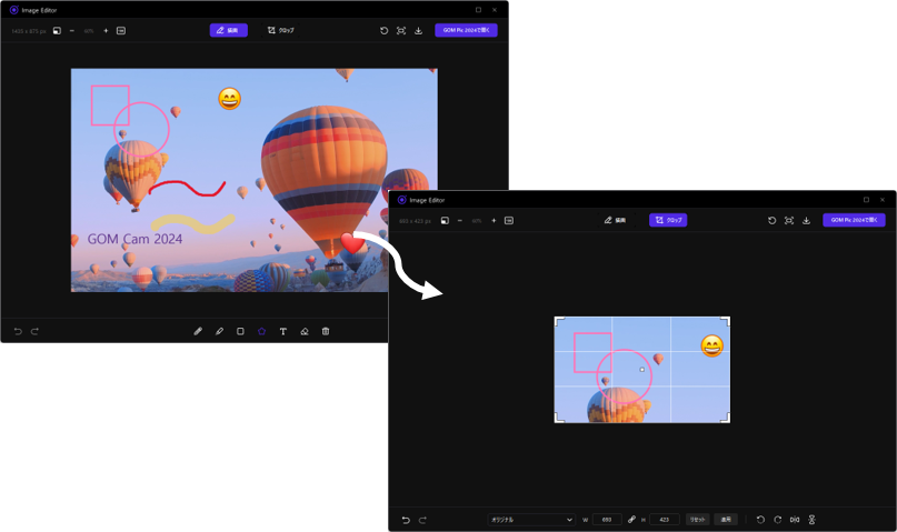 クロップ」をクリックすると、画像をクロップ、回転することができます。 イメージのサイズなどの情報表示、拡大・縮小、サイズ調整、保存機能を支援します。