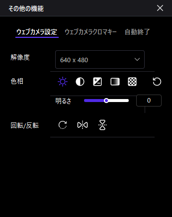 」ボタンをクリックすると、ウェブカメラを設定するか、クロマキー効果を適用することができます。または自動終了機能も設定できます。