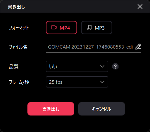 書き出し」ボタンをクリックしてください。設定ページからフォーマット・ファイル名・品質・フレームを設定します。(フォーマットとしてMP3を選択する場合、‘フレーム/秒’オプションは活性化されません。)