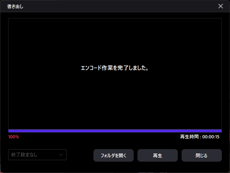 書き出しを完了したら、次の画面が現れます。保存先を開くか、書き出した動画を再生することができます。