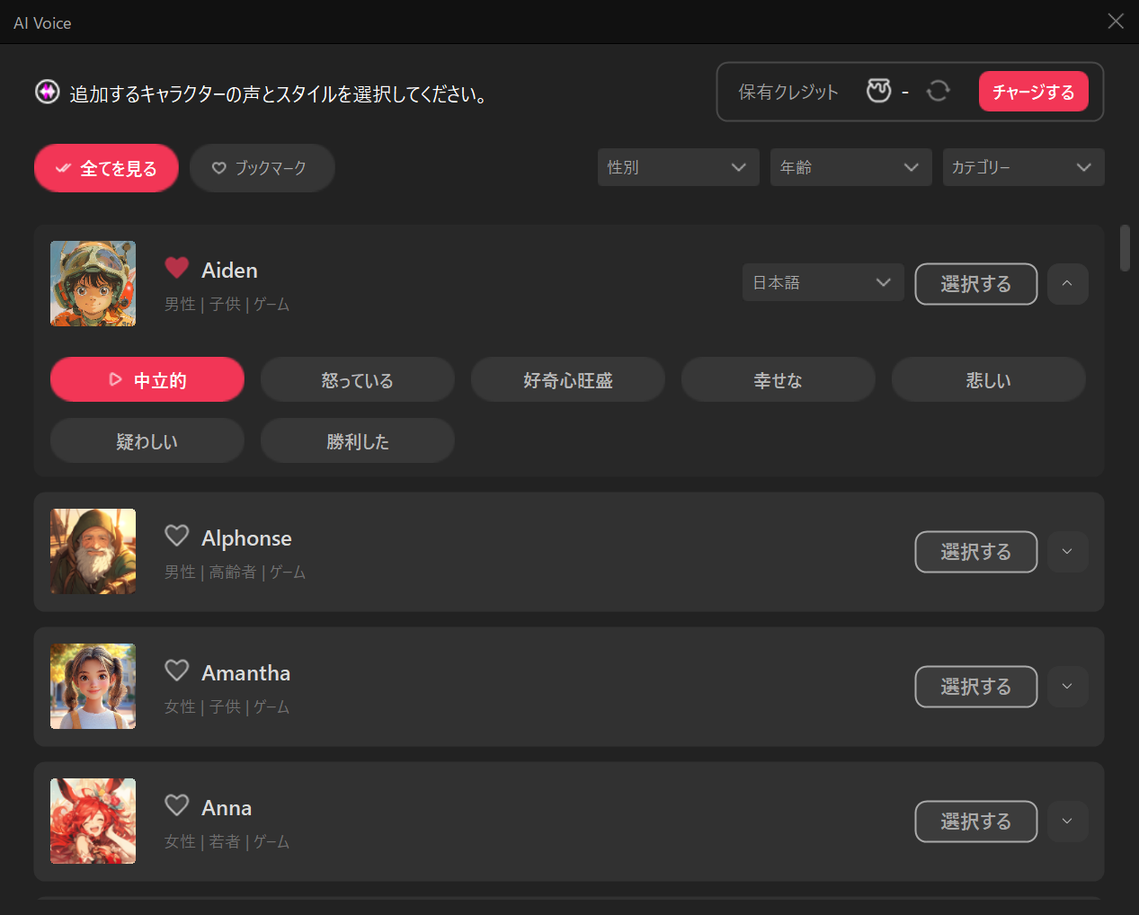AI Voiceで提供されるキャラクターリストを確認できます。カテゴリ検索で希望の性別・年齢・テーマに合ったキャラクターを選択できます。