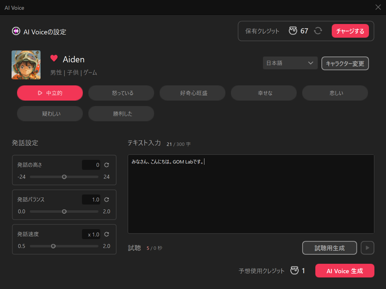 ボタンを押すと、AI Voiceがテキストをどのように読み上げるか確認できます。発話の高さ、バランス、速度などを調整できます。