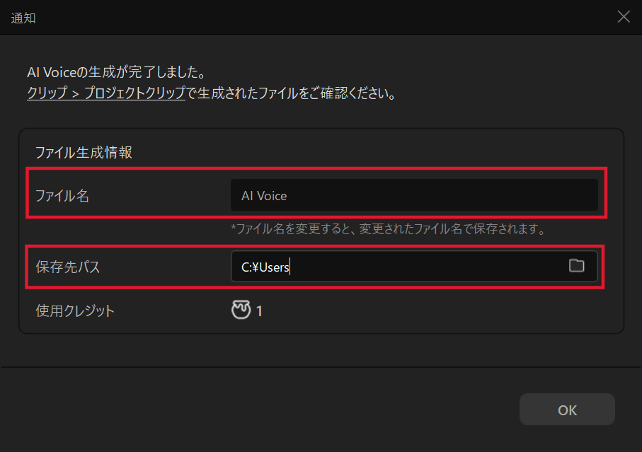AI Voiceを生成すると、入力したテキストに応じてクレジットが差し引かれます。生成が完了した後、クリップファイルの名前を指定し、保存先を設定できます。