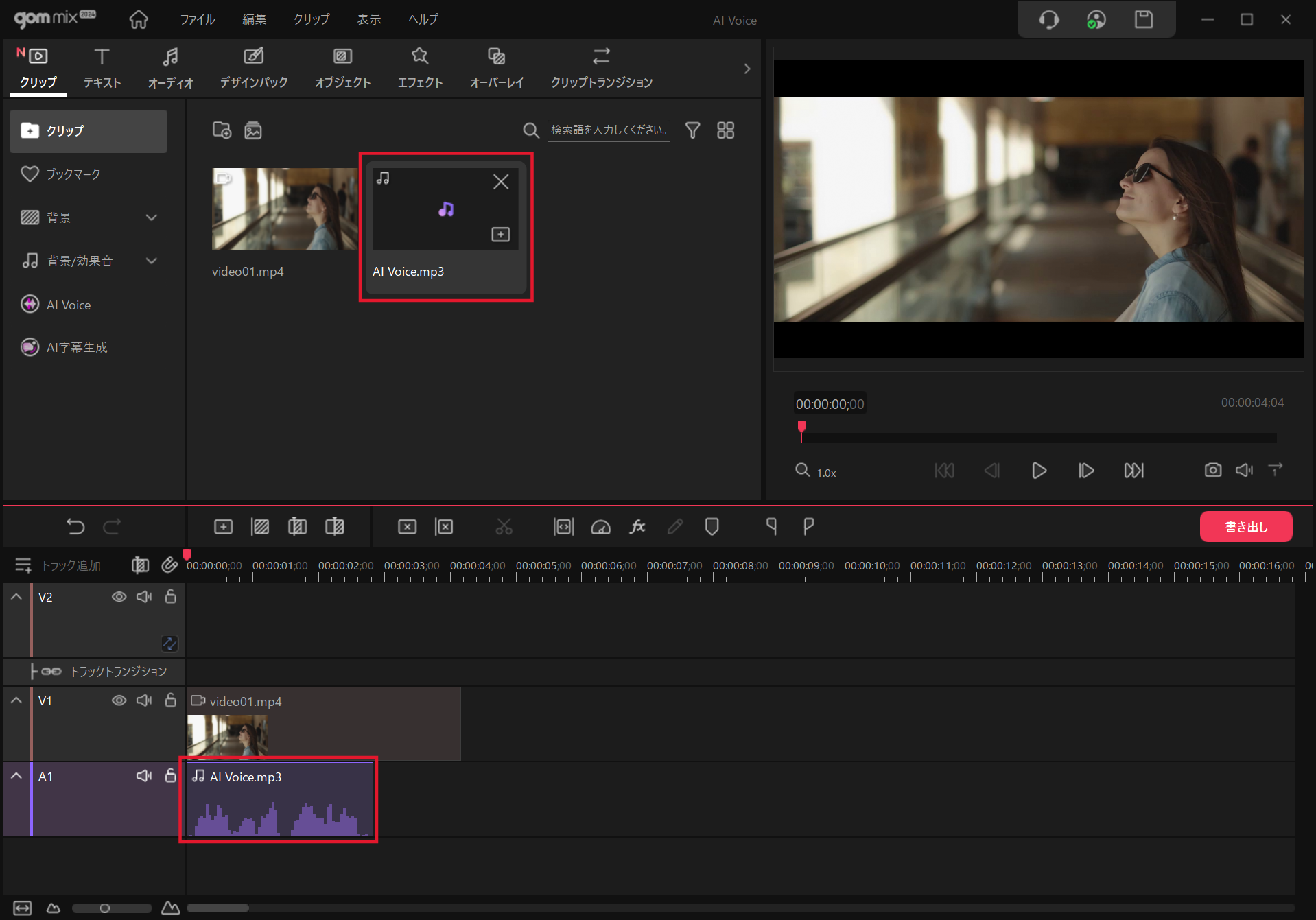 生成されたクリップファイルはクリップウィンドウで確認できます。生成したボイスクリップを希望するタイムラインに追加してください。