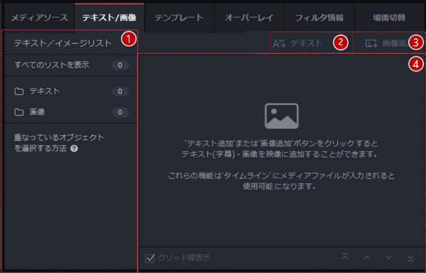 ソース及びエフェクトエリアのテキスト/イメージタブでテキストやイメージを追加することができます。