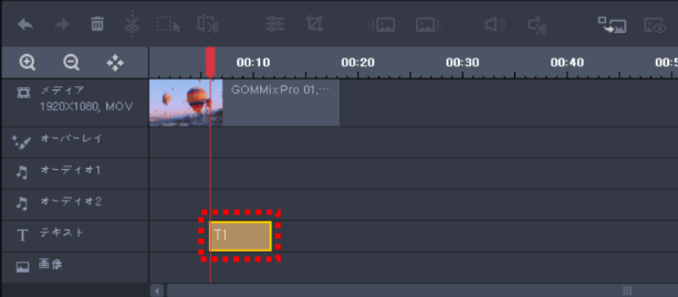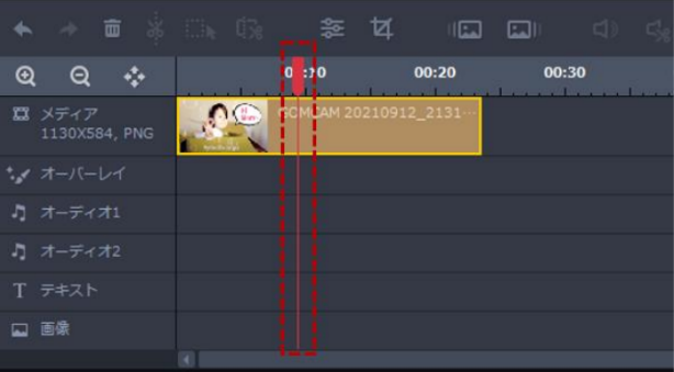 メディア素材トラックにあるメディア素材のテキストを追加したいポイントがあったら、そのポイントをダブルクリックしてください。赤い線がクリックしたポイントに移動します。