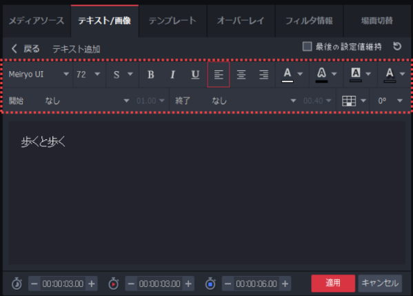 適用ボタンをクリックしてください。入力したテキストがリスト表示エリアとタイムラインのテキストトラックに追加されます。