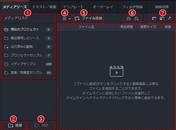 - 1. ソース及びエフェクトエリアにあるメディア素材タブをクリックしてください。