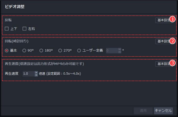 ビデオ調整を使用してメディア素材を上下、または左右に反転するか、右回りに回転でき、再生速度を調整することができます。
