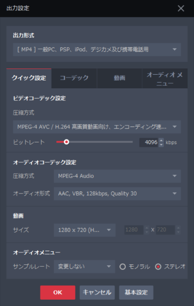 エンコーディングエリアにある出力設定ボタンをクリックしてください。出力設定画面が表示されます。