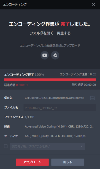 エンコーディングが終了すると作成される動画ファイルを確認してください。