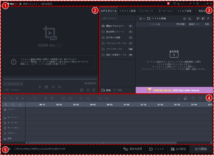 GOM Mix Proは大きく5つのエリアに分けられ、それぞれのエリアの位置と説明は次の通りです。