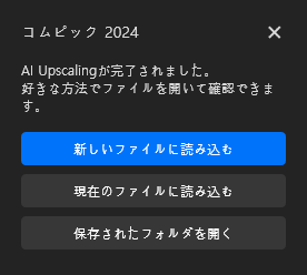 ファイルを開く方法 新しいファイルに読み込む AI Upscalingが完了した画像のみを新しいファイルとして開く 現在のファイルに読み込む 現在のファイルに新しいレイヤーとして開く 保存されたフォルダを開く 保存されたパスのフォルダーを開く