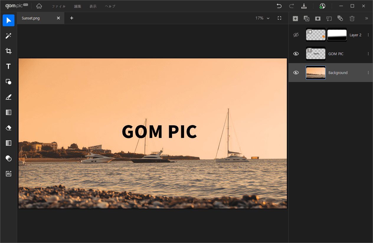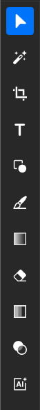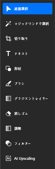 画像編集を行うためにツールを選択し、活用できる領域です。選択ツール、切り抜き、テキスト、図形、ブラシ、ペイントツール、グラデーションレイヤー、消しゴム、調整、フィルター、AIアップスケーリングで構成されており、各ツールを選択すると設定ウィンドウが表示されます。編集ツールのアイコンにマウスを置くとご覧のようにツールの名前を確認することができます。