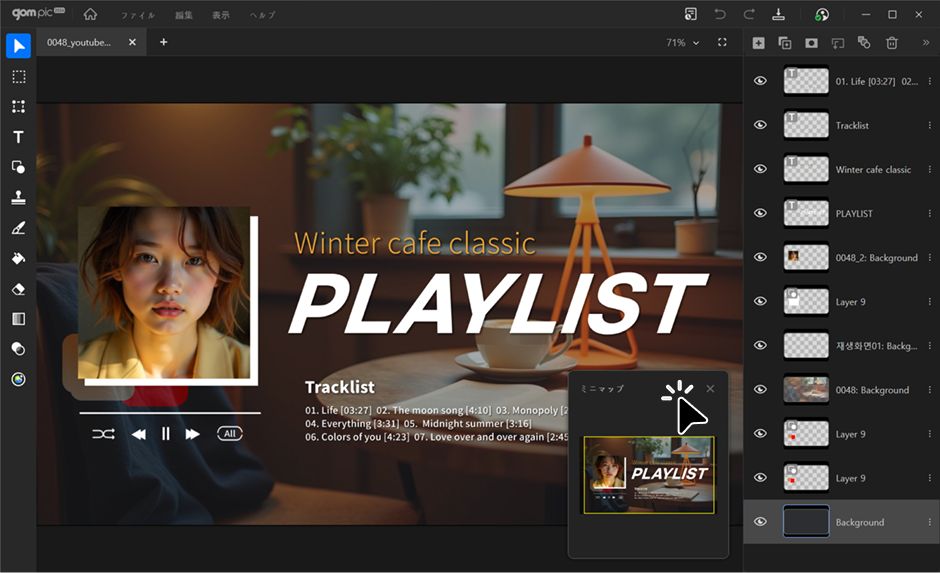 ミニマップは、現在作業中のプロジェクトの縮小プレビューであり、現在表示している画面の位置と範囲を一目で確認し、素早く移動できるようにするツールです。