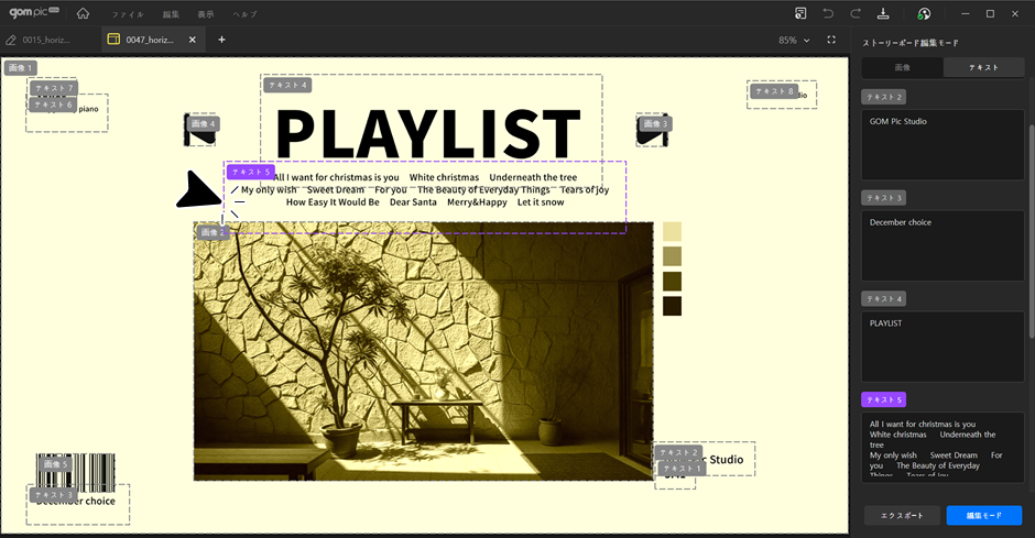 キャンバス上で修正したい画像やテキストを選択すると、右側パネルにその要素の編集タブが表示されます。 ストーリーボードモードでは、指定された画像とテキストのみ編集可能です。