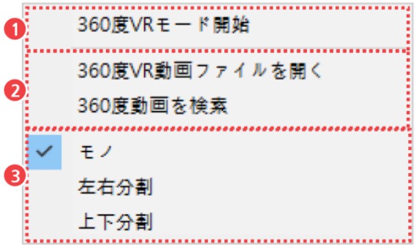 | 360度VRモード開始 | VRモードをスタートします。VRモードをスタートすると360度 VRモード停 止 メニューに変更され、もう一度選択するとVRモードが停止します。 |