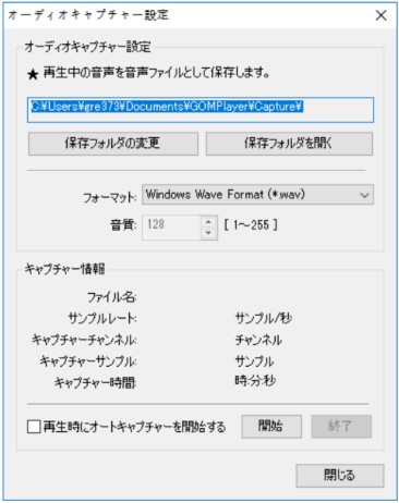 基本メニューで音声 > オーディオキャプチャー設定メニューを選択すると表示されるオーディオキャプチャー設定ウィンドウで、映像に含まれる音声をキャプチャーして保存することができます。