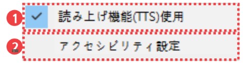 読み上げ環境を設定することができます。メニューを選択すると、使用環境の設定(詳細設定)の「その他の設定 > アクセシビリティタブ」が表示されます。 |