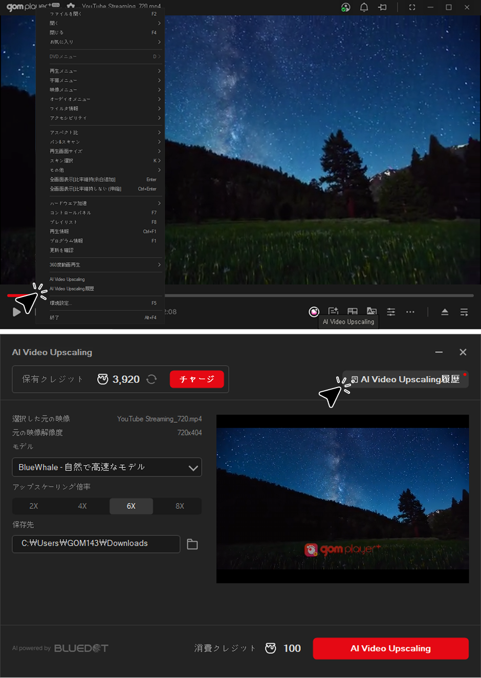GOM Player+でマウス右ボタンをクリックすると表示されるコンテキストメニューの「AI Video Upscaling履歴」ボタン、またはAI Video Upscaling上部の「AI Video Upscaling履歴」ボタンをクリックしてアクセスできます。