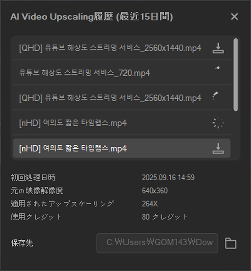 - 1) 直近15日以内のAI Video Upscaling履歴を保管します。