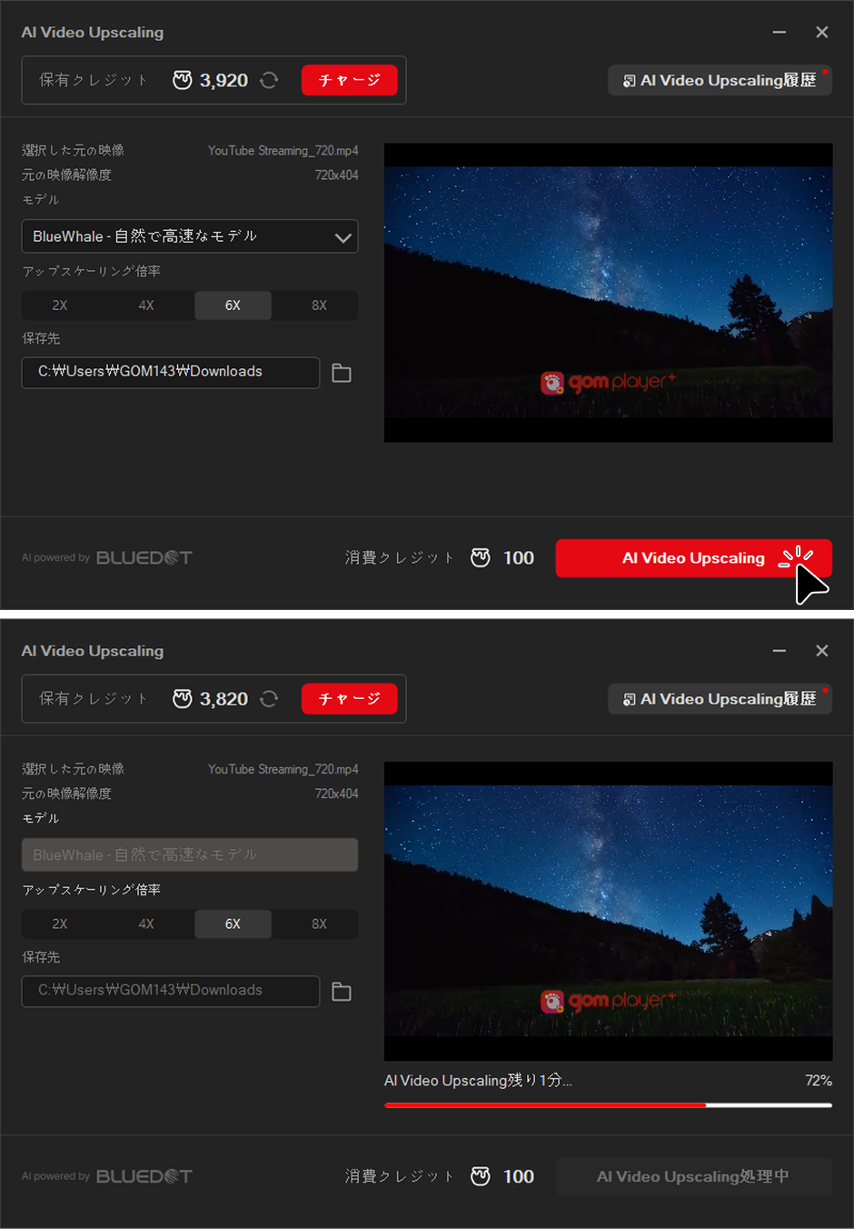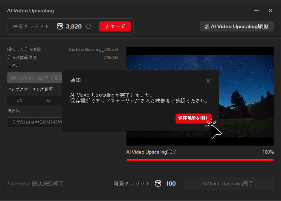 - 2) 「保存場所を開く」ボタンをクリックすると、アップスケーリングされた映像が保存されたフォルダが開きます。