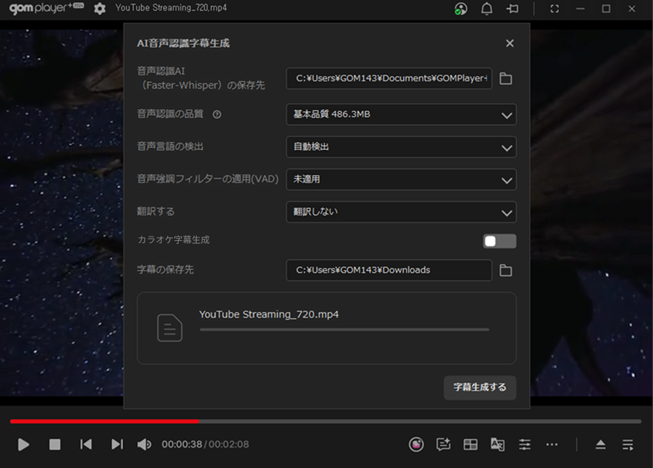 下部コントロールバーから「AI音声認識字幕生成」アイコン (F11) をクリックしてポップアップウィンドウを開きます。 機能を使用するには動画再生が必須です。