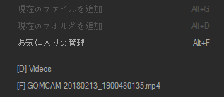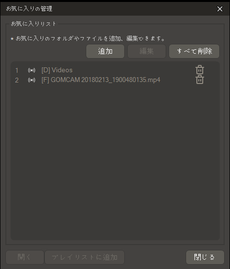 | 追加 | 動画ファイルや、動画ファイルが保存されているフォルダをお気に入りリストに追加します。 |