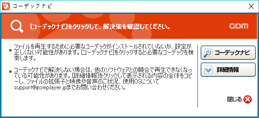 外部コーデックのインストールが必要な映像ファイルを再生すると、コーデックナビウィンドウが表示されます。このとき、コーデックナビボタンをクリックすると、必要なコーデックの情報や該当コーデックをダウンロードできるパスを教えてくれます。