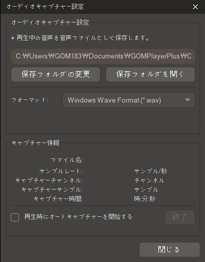 基本メニューで音声 > オーディオキャプチャー設定メニューを選択すると表示されるオーディオキャプチャー設定ウィンドウで、映像に含まれる音声をキャプチャーして保存することができます。